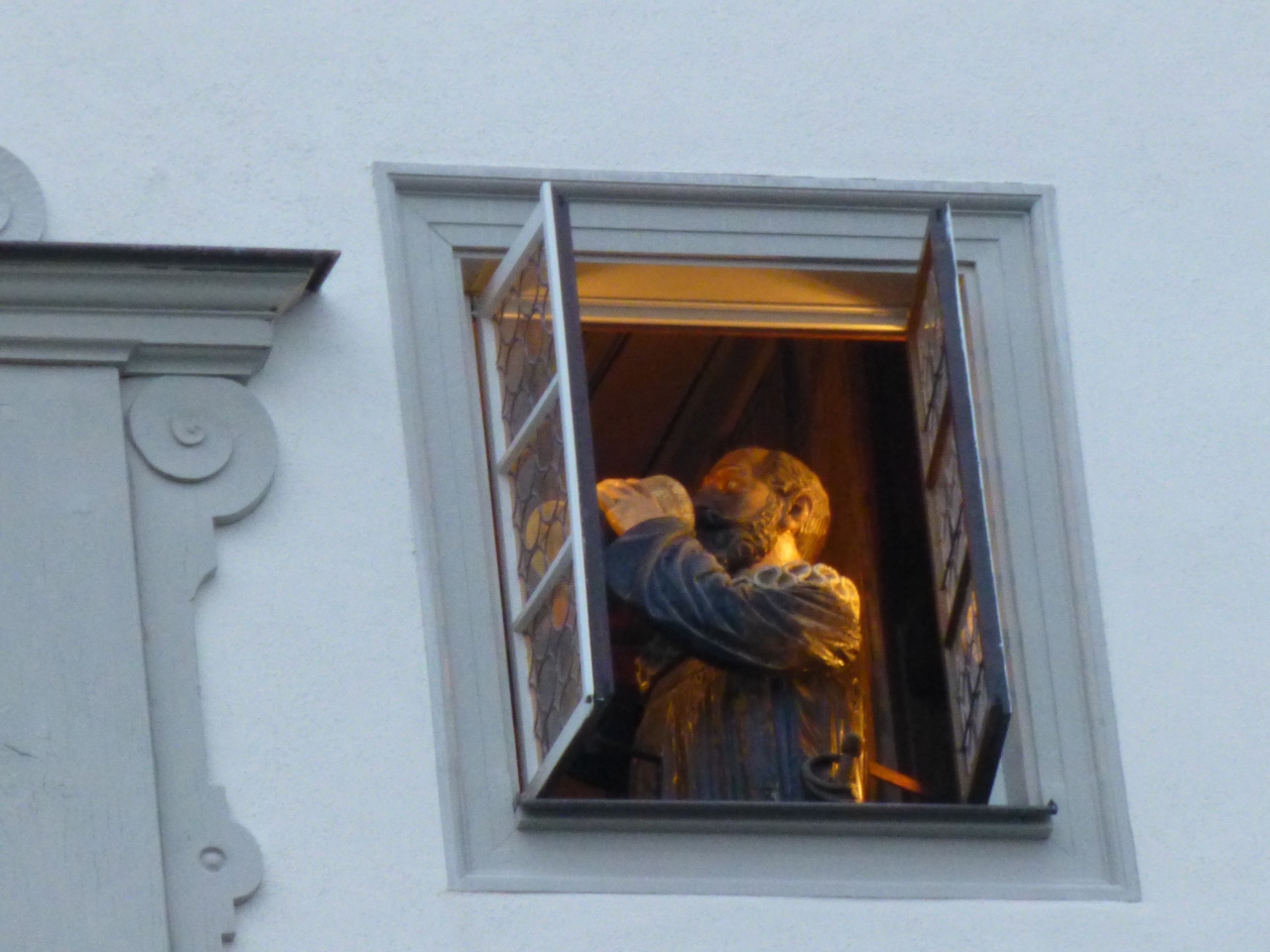 ここには仕掛け時計のついた建物があり、毎時ジャストになると窓が開き、人形がビールを飲み干すさまが少しずつ動いて行われます。