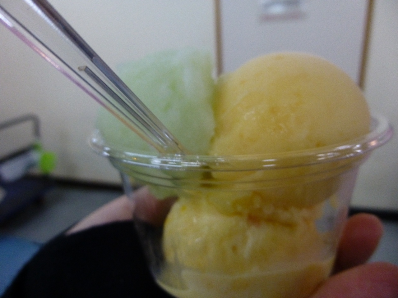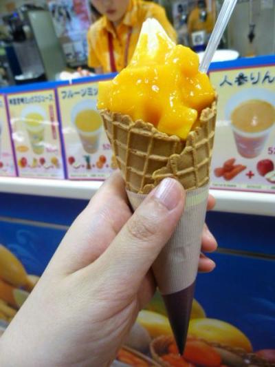 宮崎マンゴーのパフェは残念ながらマンゴーが冷凍もので、こおりついてました・・・。