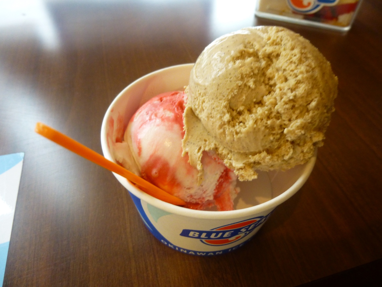 JAL機内で配られるちゅらなびを提示で、シングルのお値段でジュニアサイズ1スクープがサービスとのことで。