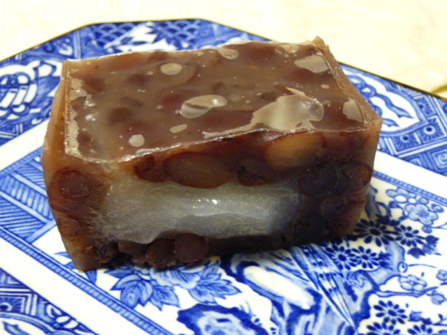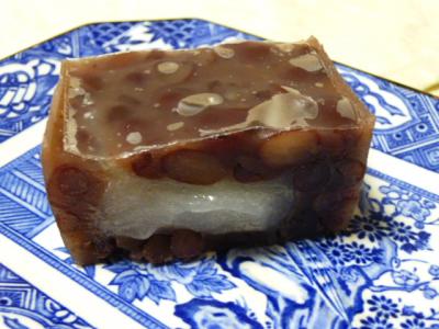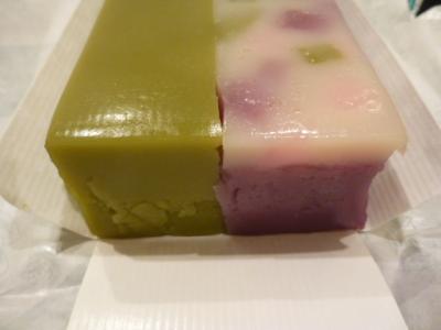 紫いものういろうの上に、モザイクカットのういろうあれこれでアジサイ風です- 旅行時期