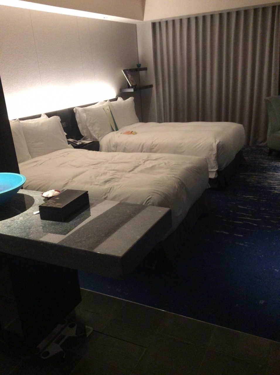 じゅうたんの青と、このホテルのテーマカラーの翡翠色の流しが素敵です。
