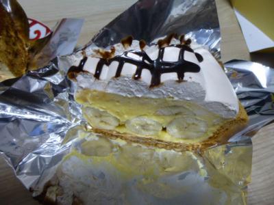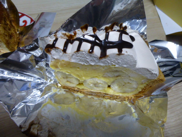 バナナのタルトはバナナがカットせずにはいってるすごいボリュームで、大きなケーキがウリのこの店らしいなあと