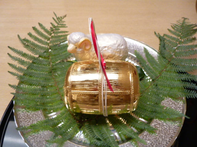 干支の羊にはカニ、黄金の米俵には紅白の水引が