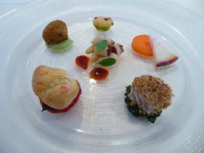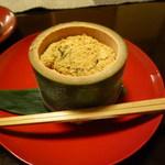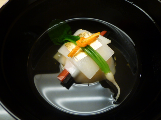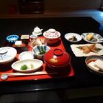 大好きな鰆の幽庵焼き、えりんぎ、車海老からすみ焼き、焼き目栗(甘め)、子持ち昆布(めっちゃコリコリ)、鮭を千枚漬けで巻いたの、湯葉揚げ(パリパリ)、柚子に入ってるのは大徳寺麩と柿とほうれん草胡麻和え(柿がむっちりで完熟もいいなと思った)