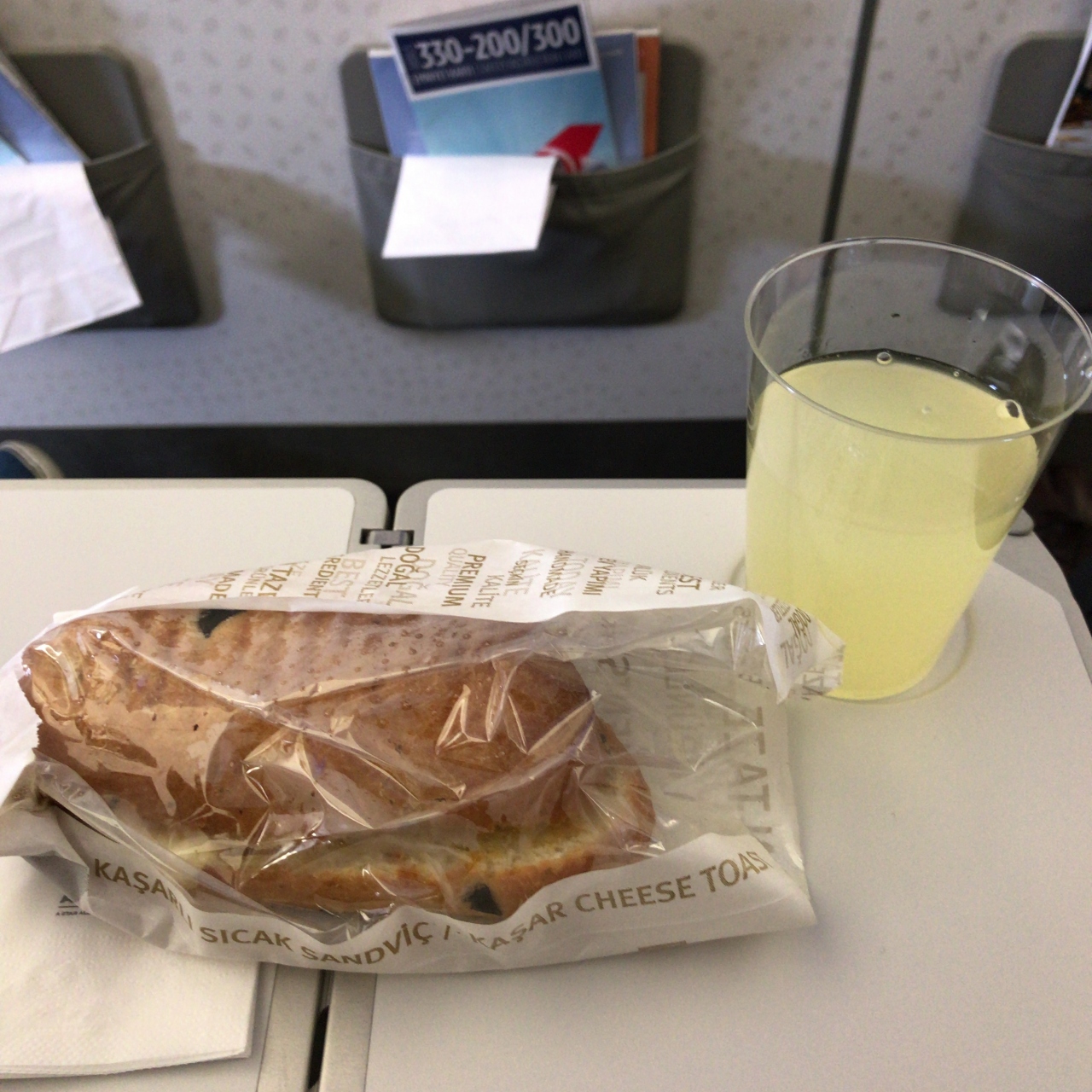 2時間足らずのフライトなのに、大きなワンプレートのセットメニューが出てきて、パン各種をテーブル間まわって配っていた
