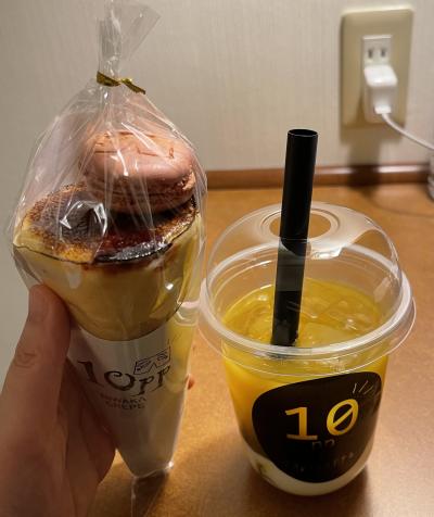 下にパンナコッタの入ったドリンクと、ニワカの焼きが入ったマカロンがのったムチムチ生地のクレープのお店です。- 旅行時期