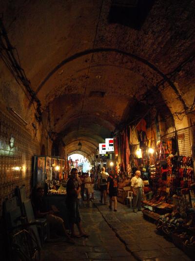 通りの両側に金物細工、衣類、革製品、陶器、おみやげなどを扱うお店が立ち並んでおり、買い物客と客引きの人たちで活気に満ちています。