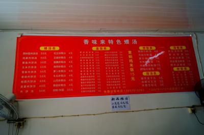 この店のメニュー。スープは3.5元(70円)、焼きそばは6元(120円...