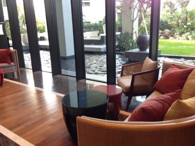 逆に、繁華街から少し離れているだけで、那覇市内とは思えない静謐な雰囲気の漂う、素敵な空間が広がっています。半吹き抜けになっているロビー横のラウンジは、海外のリゾートのよう。プールも市内とは思えない、リゾート地のホテルの雰囲気です。