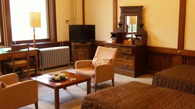 今回は本館のデラックスタイプのツインに宿泊。バス・トイレの清潔さが一番気になるところなのですが、ちゃんと改装済みでもちろんウォシュレットだったのも◎。予約時のメールのやり取りで、そのあたりの説明や、「なるべくレトロな雰囲気の部屋に泊まりたい」という私のリクエストに丁寧に答えてくれ、希望の部屋を押さえて下さったスタッフとのやり取りも好印象でした。