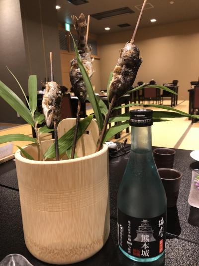 宿泊者専用のお部屋で、やまめの塩焼きや赤牛のせいろ蒸しなどの和食メニューヲいただきました。ボリュームたっぷり、特にお刺身が抜群に美味しかった。