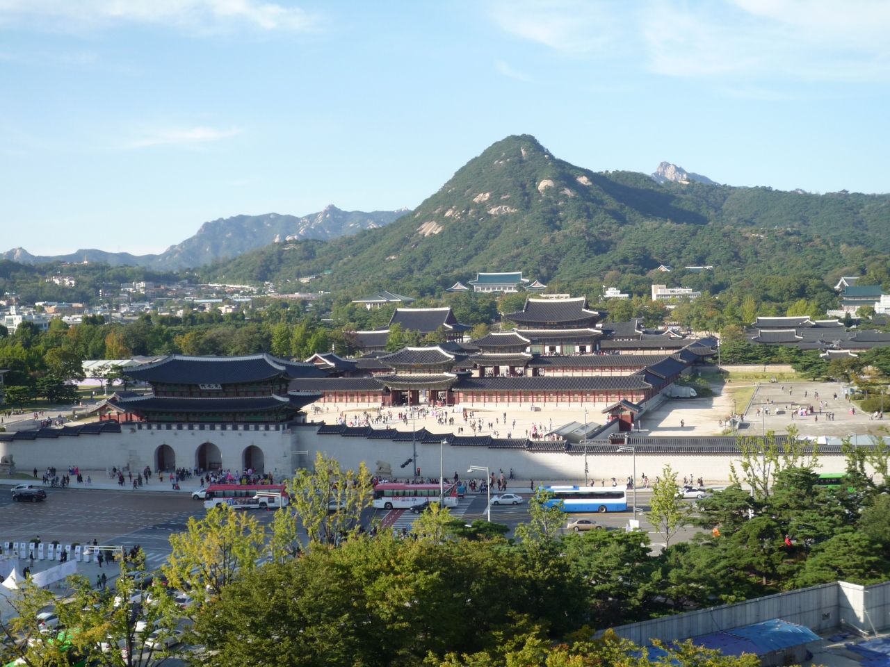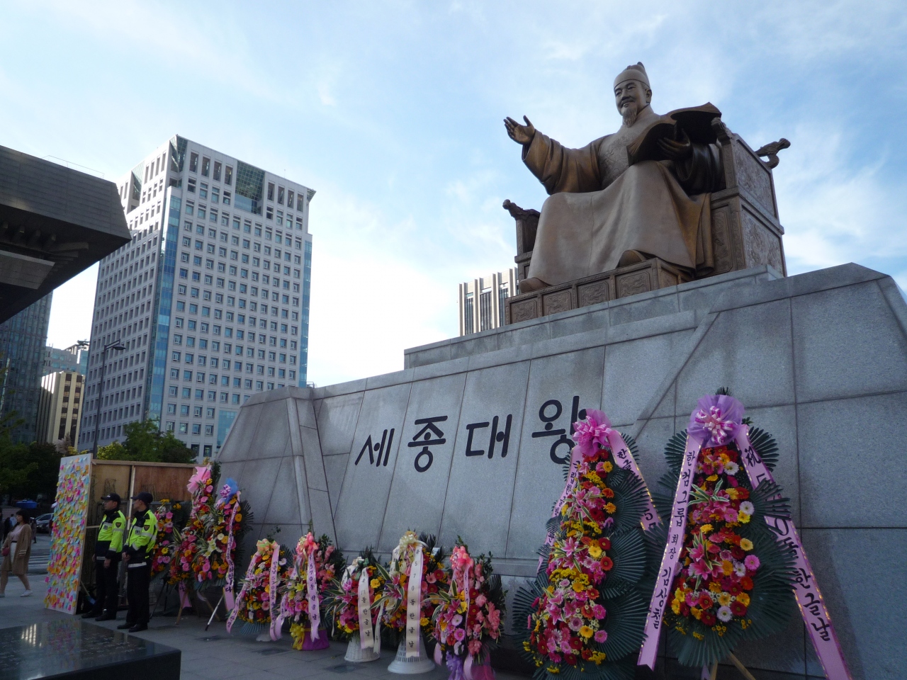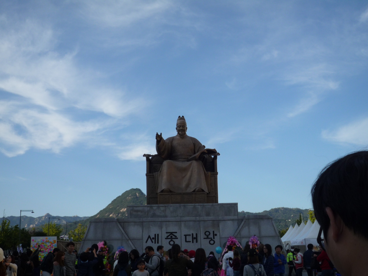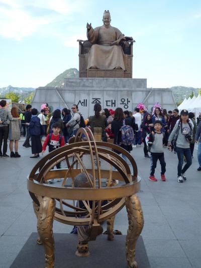 李氏朝鮮時代の名君主、世宗大王様の銅像があり、その奥には景福宮、大統領府と韓国を代表するエリアです。