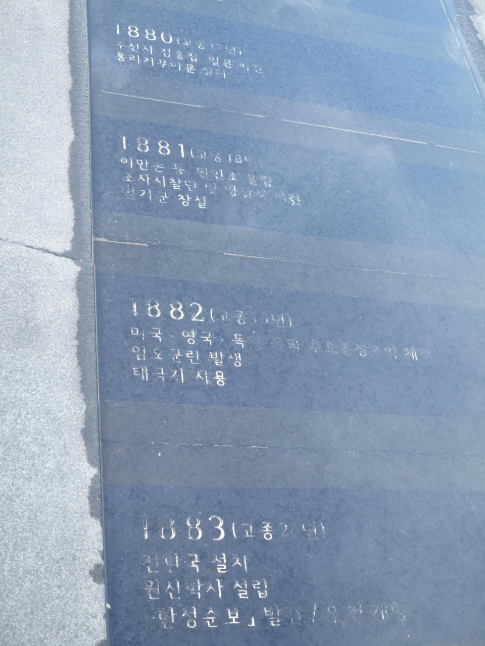 銅像の脇には歴史年表の水路があり、じっくり見たいのですが、休日はイベントもあったり市民でにぎわっていますので、なかなかたどれません。