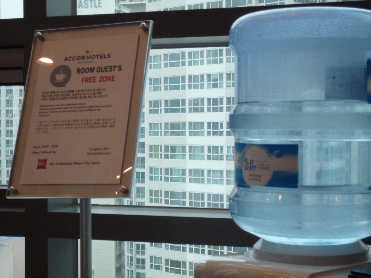 チェックアウト後に利用した17Fのレストランの一角にホテルゲスト専用のスペースがあって、水やコーヒーが自由に飲めるようデシタ。