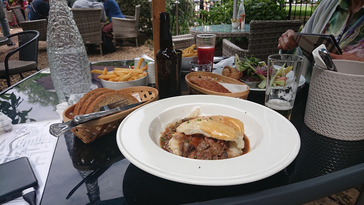 コッツウォルズ観光ツアー3番目のボートン・オン・ ザ・ウォーターで遅めのランチです。バスの車内で到着前に地図が配られました。10数件カフェ、レストランがありましたが、英国料理のレストランは2件。小川の近くは、この「ザ・ローズ・ツリー・レストラン」しかないので、ここに決めました。ツアーの方が来ると座れなくなるので、早歩きで来ました。外の小川に近い席が取れました。天気は良いし。パラソル付きのテーブルが気分を盛り上げてくれます。レストランに居ながらピクニック気分。従業員の方も、英語が不自由な自分な対し、親切、フレンドリー。飲み物は、家内はトマトジュース。イギリスに来て、トマトジュースがスーパー、レストランで無くて困ってました。とても美味しかったそうです。自分は、旅の記念に地元のビール。お薦めのホークストーンプレミアムビールを。飲みやすかった。美味しかった。料理は、家内はイギリスで有名な「プラウマンズ・ランチ」(農夫の昼食、これを食べれば、午後もしっかり働ける)を。このレストランでは、3種類有りました。基本は、サラダ、ピクルス、コールスロー、リンゴ、セロリ、全粒粉のパン、バターです。これにメインによって値段が変わります。ハムとチェダーチーズのプラウマンズ・ランチ 14.25£。3種類のチーズ(チェダー、スティルトン、ブリー)のプラウマンズ・ランチ 14.5£。レストランの名前の付いたローズツリープラウマンズ・ランチが15.95£。家内はローズツリープレグマンズランチにしました。先程の基本にハム、ポークパイと3種類のチーズ(チェダー、スティルトン、ブリー)が付いて来ました。盛り付けもとてもお洒落。家内も美味しいと喜んでおりました。自分は、ステーキマッシュルームキドニーパイ(腎臓肉のパイ)独特の香辛料、ハーブが感じられます。少し癖が有ります。完食しました。何故か、一匹の大きなハエがキドニーパイに飛んできます。独特の匂いがするのでしょう。左手でハエを払いながら、右手でフォークで食べる感じです。お腹一杯。メニューを写真で撮影してきたのですが、今思うと、デザートも食べたかった。でもお腹一杯。集合時刻も間近。慌てて、写真撮影しながら、集合場所に戻ってきました。BS141 8/25(金)22時30分から放映されたハンカチ王子の斎藤選手がコッツウォルズの別の村でやはり「プラウマンズ・ランチ」を食べてました。皆様もボートン・オン・ ザ・ウォーターに行かれた際は、天気のよい日は「ザ・ローズ・ツリー・レストラン」の外の席で優雅なランチは如何でしょうか?