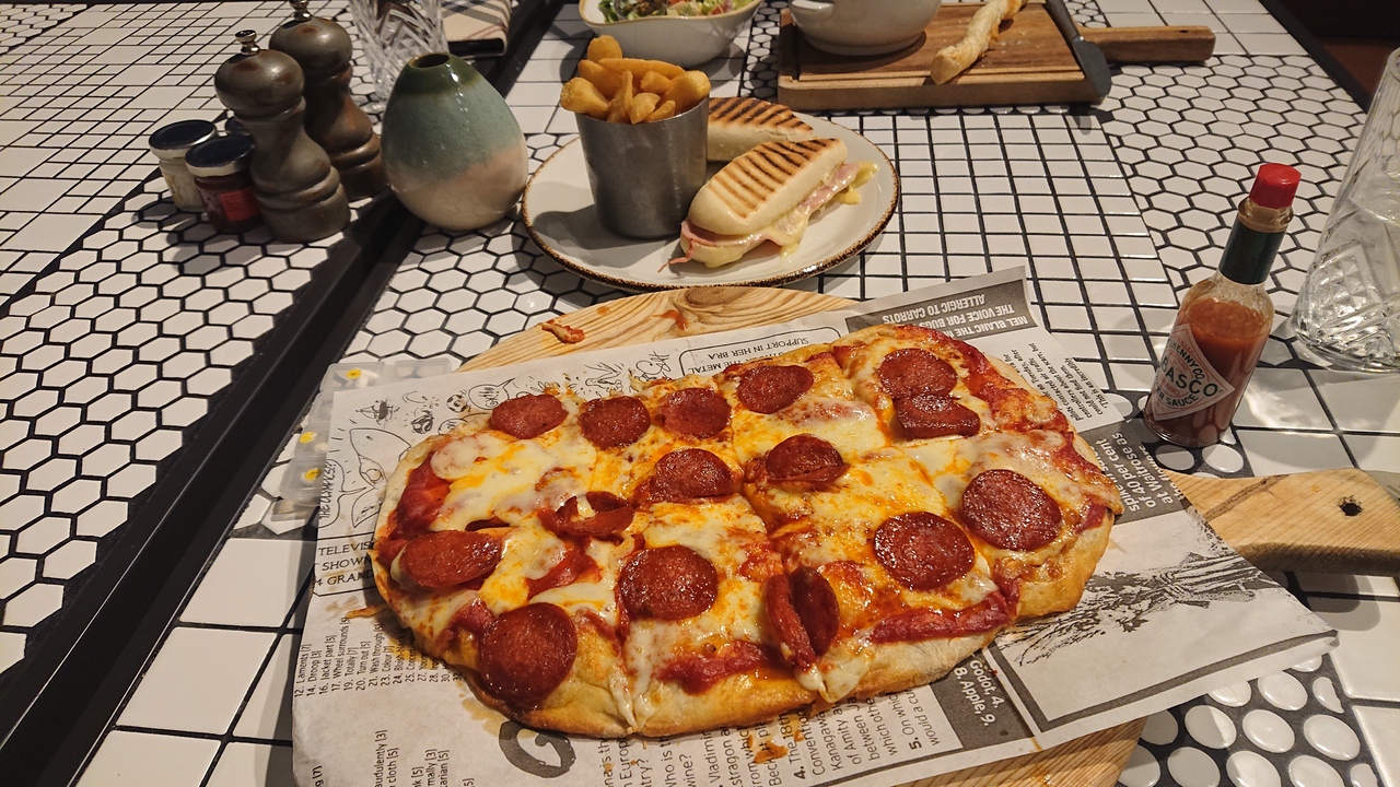 ロンドンからカンタベリー大聖堂に日帰りツアーで行きました。大聖堂を見学し、クライストチャーチ門を出、「バーゲート」という通りを左(門を正面にすると右)に行くと、左右に様々なお店が有ります。私たち夫婦とツアーで知り合いになった方3人でランチを食べようとレストランを探してました。丁度、左側にピザのお店が有りました。あまり時間がないのと、ピザ焼くのに時間かかるかなと心配しながら、テーブルが空いていたので入りました。カジュアルなレストランで、南向きに面しているので、中が明るいです。私は「アメリカーノ」とコーヒー、家内は王道の「マルゲリータ」とオレンジジュース、知人は「クワトロフォルマッジ」と炭酸水。早く出てきました。美味しい。知らなかったのですが、サワードウ(発酵)生地を使っているとのこと。お店の正式名称名も「チャプター サワードウ ピッツェリア アンド バー」です。少しずつ、他のピザを交換して食べましたが、美味しかった。旅先だから?お腹がすいていたから?いや、本当に美味しかった。また、食べたい。デリバリーで頼めないかな?後から知ったのですが、お店、結構、広かったみたい。余裕無かったからな。奥の方だと、屋根が一部透明で、カンタベリー大聖堂見ながら食べれるようです。