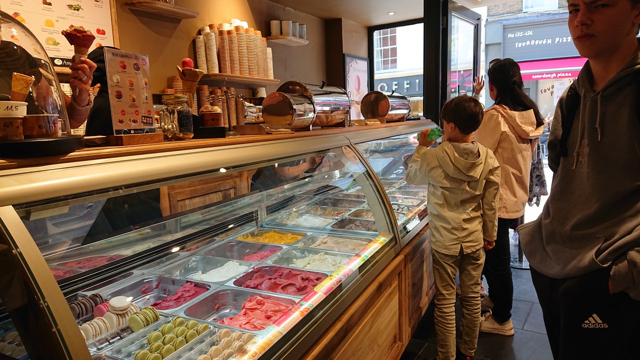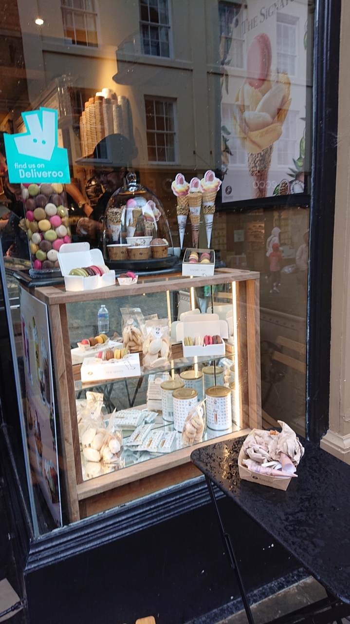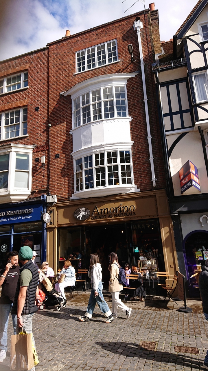 家内とウィンザー城、ロングウォーク見学、昼食後、お洒落な商店街で偶然見つけました。ロングウォークの城入口から城に沿ってある通り「キャスル・ヒル」を直進、最初の信号のある交叉点(B3022)を渡ると石畳のピースコッド・ストリートを行くと、左手に有ります。自分は普通のジェラード屋さんと思ってましたが、びっくり。オーダーはQRコードをスマホで読み取って注文、決済。コーンに家内はピスタチオ、自分はアモリーノ・チョコレートを注文。ジェラートをスプーンで少しずつ取ってのせてはスプーンを水で洗う。何度も何度も繰り返し。ジェラートの入っているショーケース越しなので良く見えません。やけに時間がかかるなと思っていたら、出来上がり。とても綺麗な薔薇のよう。花びらを一枚ずつ作っていたのです。最初から知っていたら、チョコレート系にしなかった。味も美味しい。マカロンを追加して、真ん中に入れると薔薇の感じが余計に引き立つ。アマリーノは、フランスのイタリアン・ジェラートのお店。ホームページによると、フランス、イギリス(ロンドン他)、スペイン、ポルトガル、オランダ、ドイツ、スイス、イタリア、チェコ、モロッコ、マヨルカ島、カナリア諸島、アメリカ、メキシコ、フランス領のカリブ海の島、ニューカレドニア、エジプト、サウジアラビア他に有るとのこと。一覧表ではなく、世界地図での表示なので見にくい。インスタ映えするので、日本にも是非とも、開店して欲しい。是非とも日本で開いて欲しい。口コミ書きたかったのですが、ウィンザー店が無かったので申請しました。