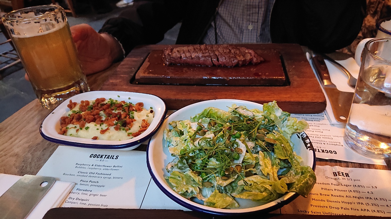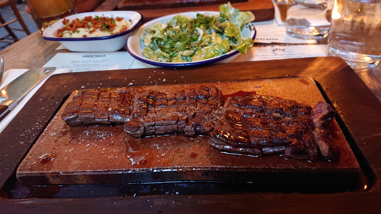 ロンドン最後の晩餐を、美味しい物で締め括りたく、スマホで探しました。ホテル徒歩4分程度に口コミの評価が高いステーキ店が有ったので、飛び付きました。場所は、ロンドン・ブリッジ駅からトゥーリーストリートを東に10分弱歩いた所右手に有ります。8月の日曜日の19時過ぎに家内と二人で行きました。混んでます。人気有ります。名前と電話番号を書いて、外で待ちます。45分位で入れました。中は、少しだけ暗め。リブアイステーキ、和牛ステーキ、グリーンサラダ、マッシュポテト、ビール2つ頼みました。ステーキは食べ比べのつもりでした。最初に無料のポップコーンが籠に入って出てきます。つまみながらビールを飲んで待ちます。ステーキが出てきました。夫婦共々、あまり口に合わず、残してしまいました。日本で、チェーン店のワンコインの牛丼や、1,000円台のステーキチェーンのステーキ美味しく残さず完食します。カナダで食べた赤身のステーキ、スーパーの海外の牛肉、ステーキで焼いて美味しく食べます。まして、和牛ステーキも和牛の味がしませんでした。会計すると、サービスのミニソフトクリームを人数分くれます。ソフトクリームが一番美味しかったかな。
