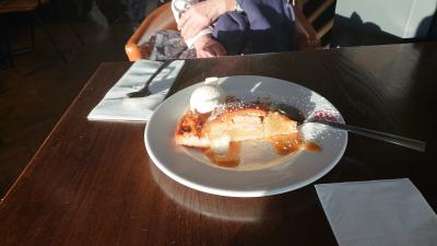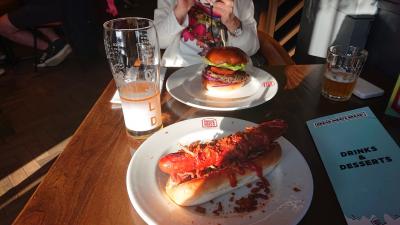 エジンバラの最終日の夕食、ホテルへの帰り道、偶然前を通りかかり、雰囲気が良さそうだったので、家内と入りました。場所は、ウェーバリー駅の近く、ノース橋を渡った左側、エジンバラ城からロイヤルマイルを下り、最初の信号のある交差点を左折、ウェーバリー駅方向、ノース橋を渡る手前右側です。西に面してるので、西日が眩しかったです。後から知ったのですが、このお店は、エジンバラで最高、ヨーロッパで20位以内、世界で50位以内のハンバーガーレストランです。家内はクラシックバーガー、自分は野菜嫌いなのでニューヨークドッグにしました。クラシックバーガーは、レタス、トマト、玉ねぎ、ピクルスが入ってます。ニューヨークドッグは、ベーコン、フライドオニオン、ケチャップ(マスタード抜きにして貰いました)です。兎に角、ハンバーグ、フランクフルトがとてっも美味しいです。一緒に飲んだお奨めの英国のドラフトビール コールド タウン ネイパも飲みやすく、最高の晩餐でした。デザートにキャラメルアップルパイ、こちらは、レンジで少し温められ、アイスクリームと生クリームがのってました。こちらは、少し甘めでした。エジンバラで食べるところに迷ったら、如何でしょうか?口コミ登録したく、登録されてなかったので、登録申請しました。