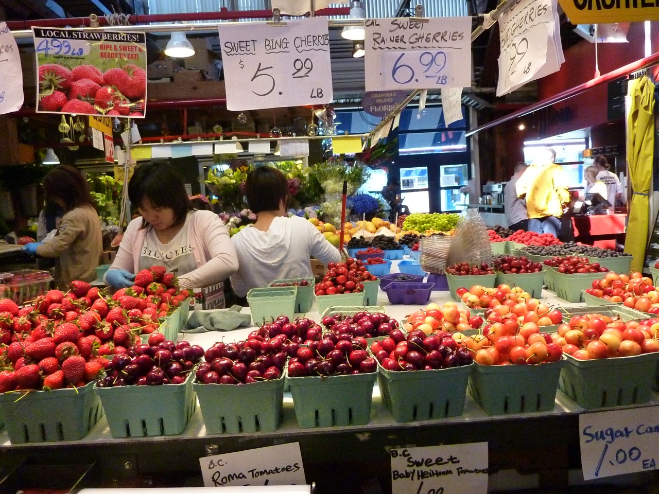 近畿日本ツーリストのホリデーで、バンクーバーに着いて最初に連れてってもらいました。パブリック・マーケットに行きました。果物他たくさんの食品がありました。ホテルの朝食にフルーツがたくさん出て美味しかったので、気に入った苺とブラックベリーを購入しました。多少の時間潰しには良いと思います。