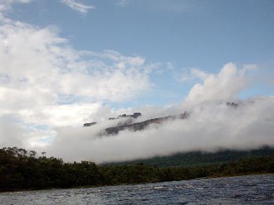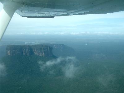 飛行機の窓からは「テプイ」と呼ばれるテーブルマウンテンと、ジャングルと...