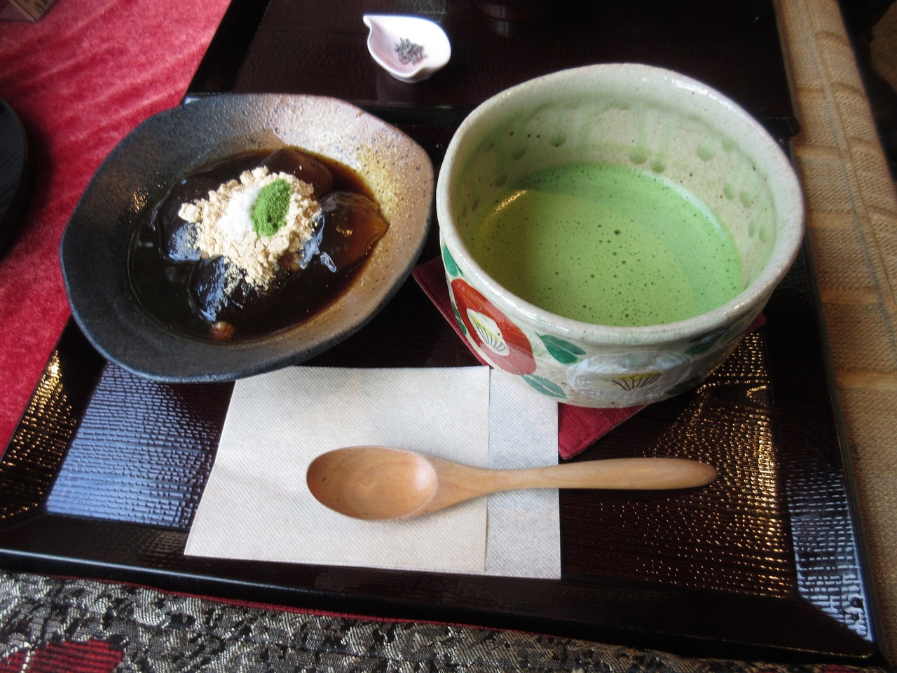 黒糖のお汁に浸かった蕨餅の上にきな粉と