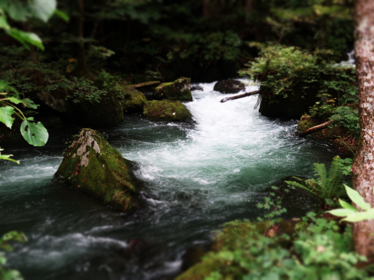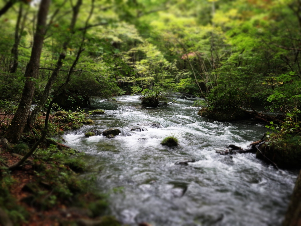 奥入瀬川沿いに、遊歩道と車道が並走して
