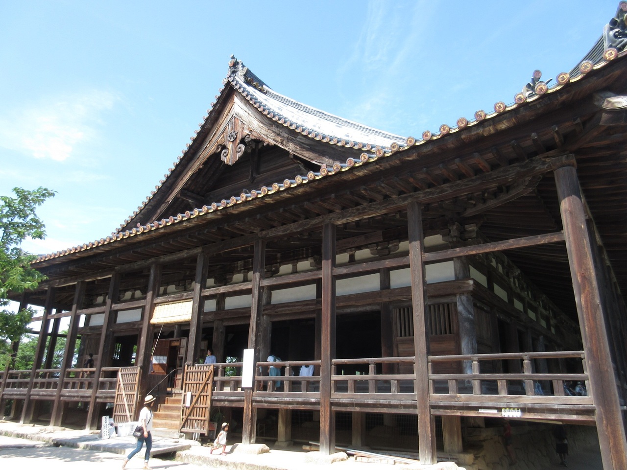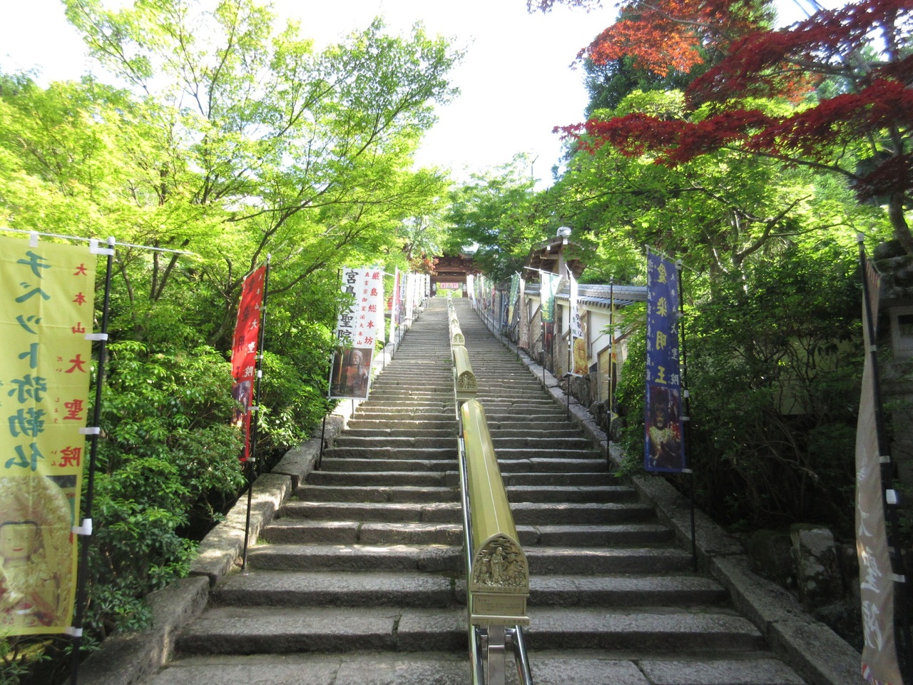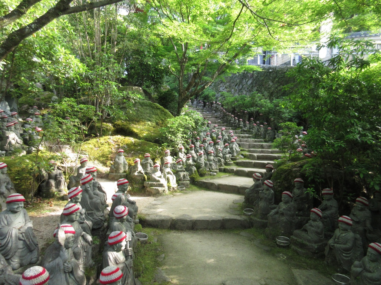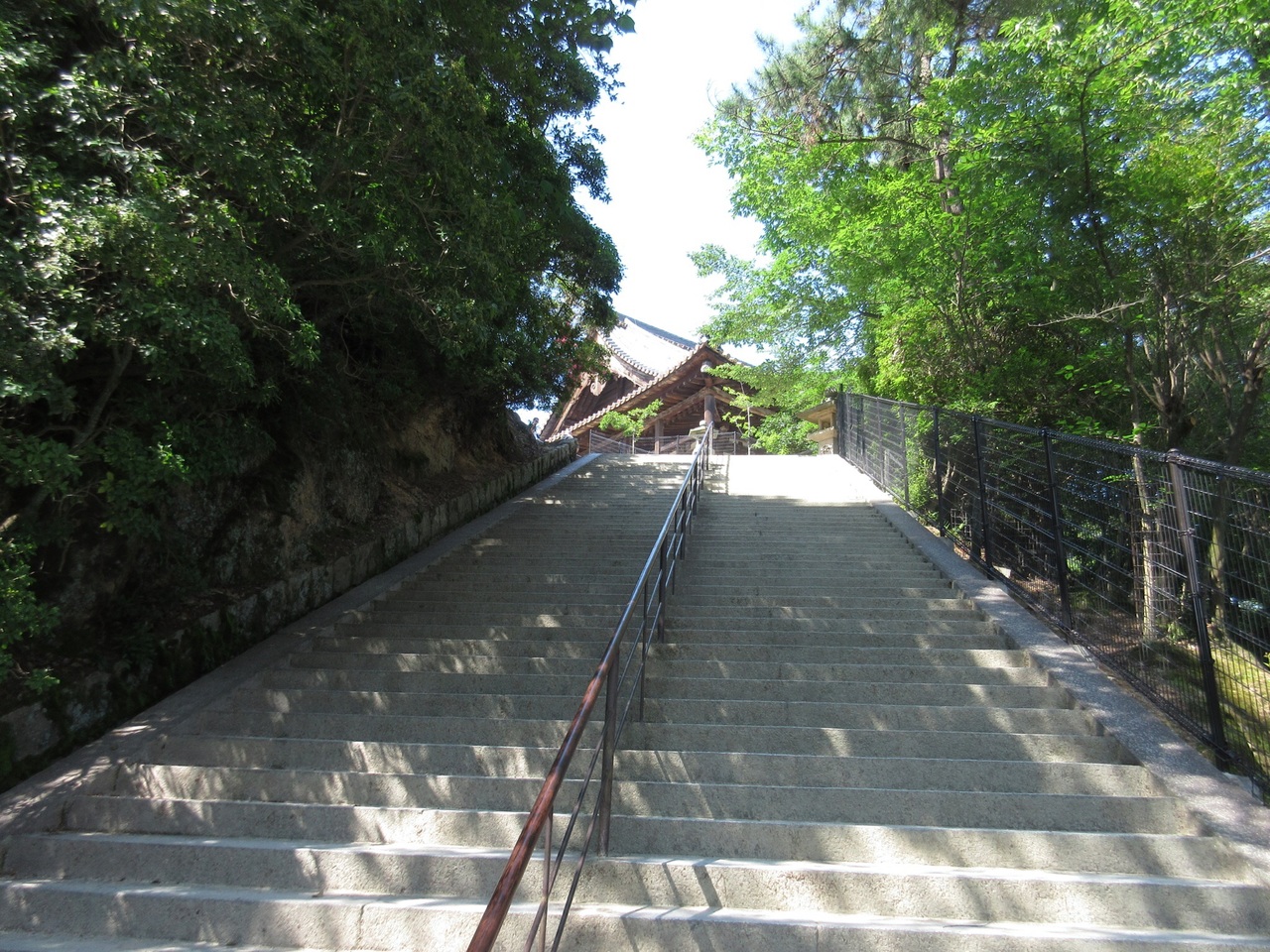本堂へ繋がる長い階段には、仏陀の弟子たち