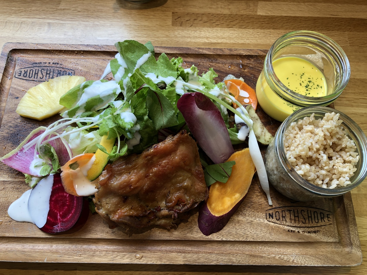 グリルチキンと温野菜、スープ