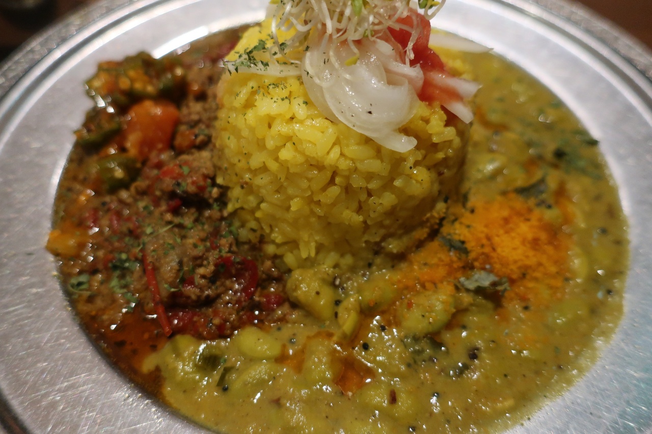 オクラとトマトのマサラと食べるスパイシー足豚キーマ