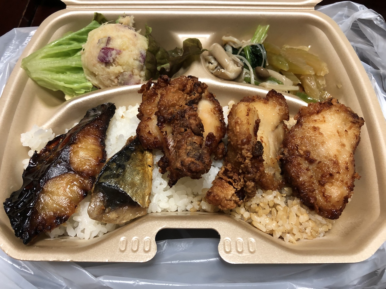 メインは唐揚げと鯖の塩焼きを