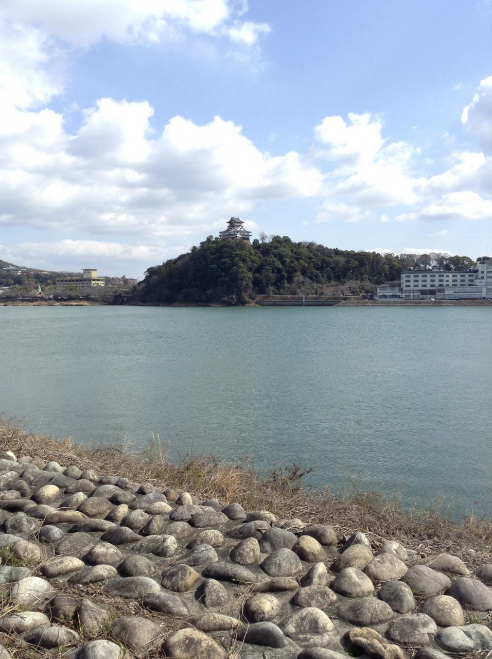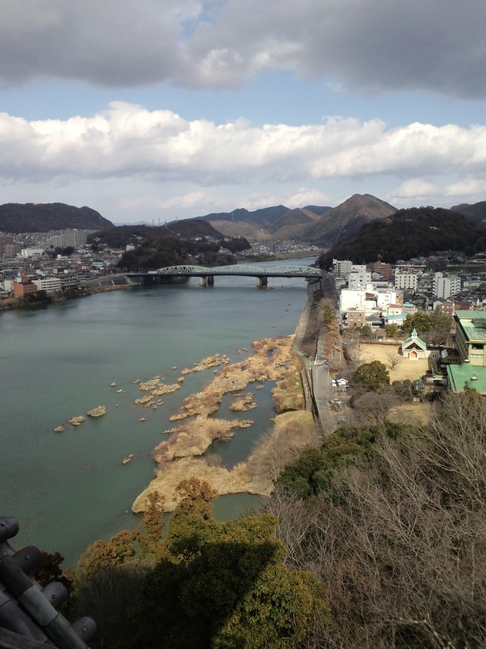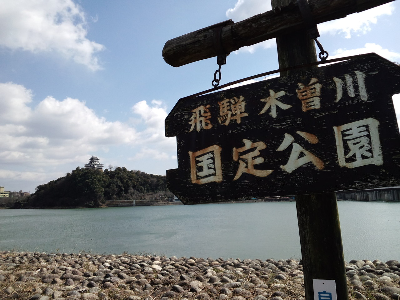 眼下に木曽川が流れ、周りの見晴らしがとても素晴らしいのですが、木製の欄干(これも国宝の一部なのかな)が低くて腰の辺りなので外に出ると、ちょっと怖い感じがします。その上、人がやっとすれ違えるその床は気持~ち外側に傾いているのでよけいに怖かったです。