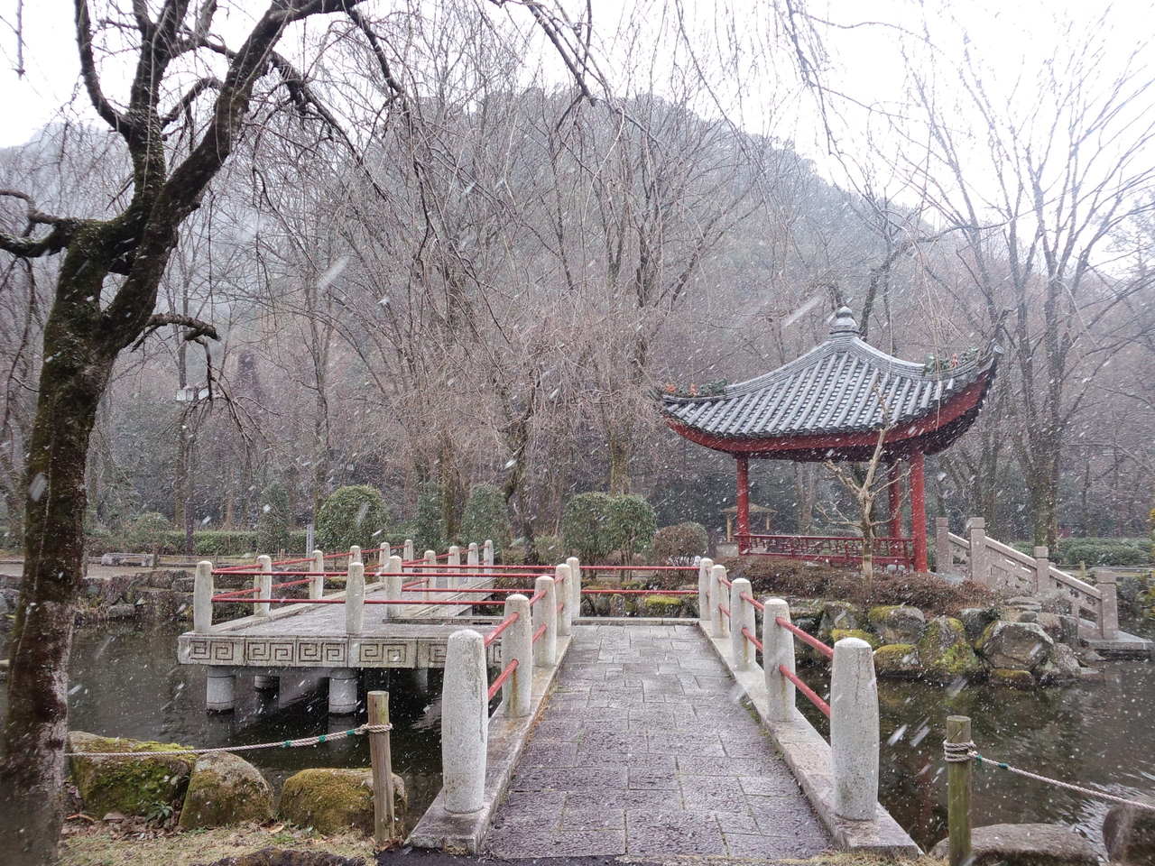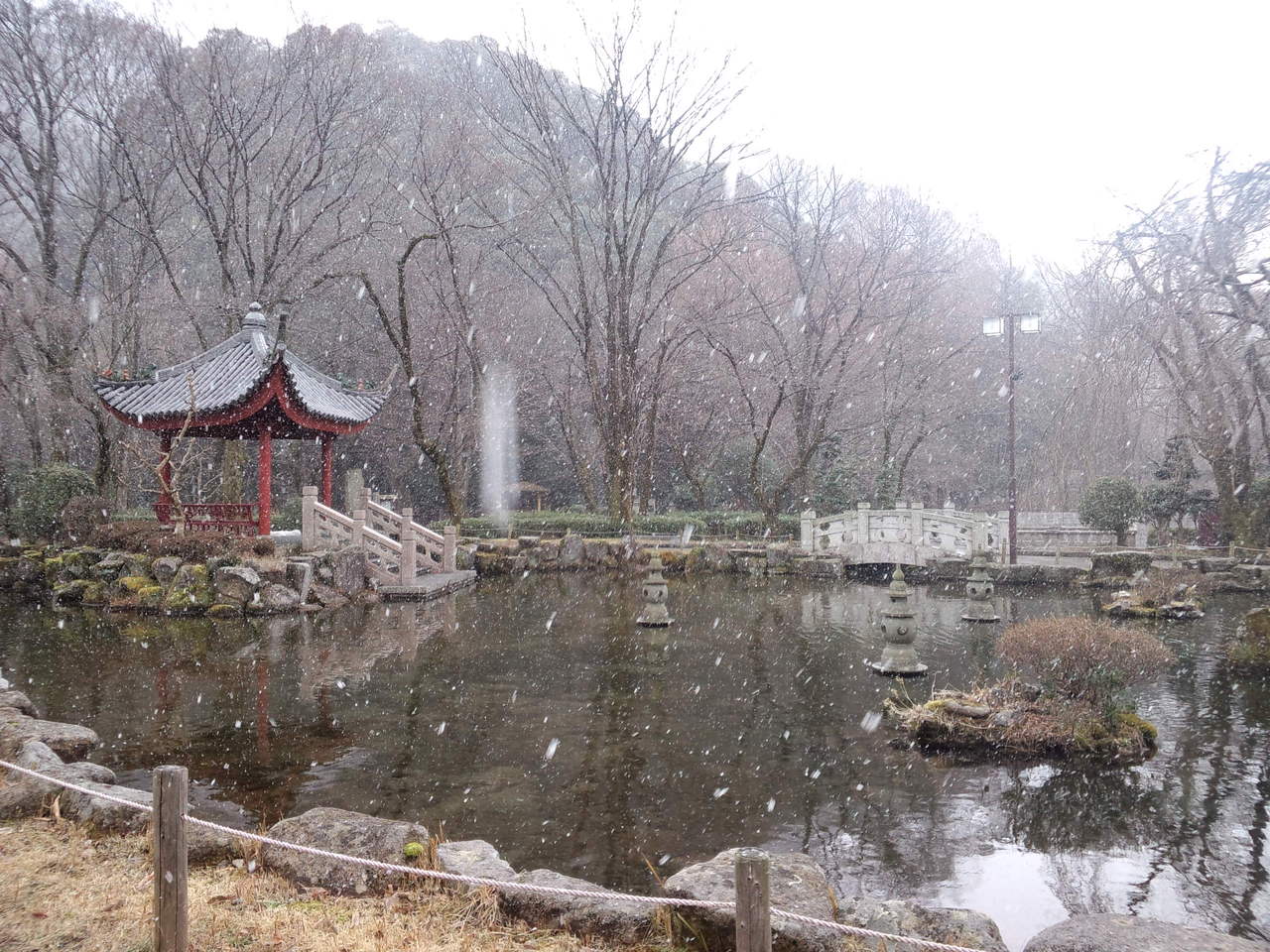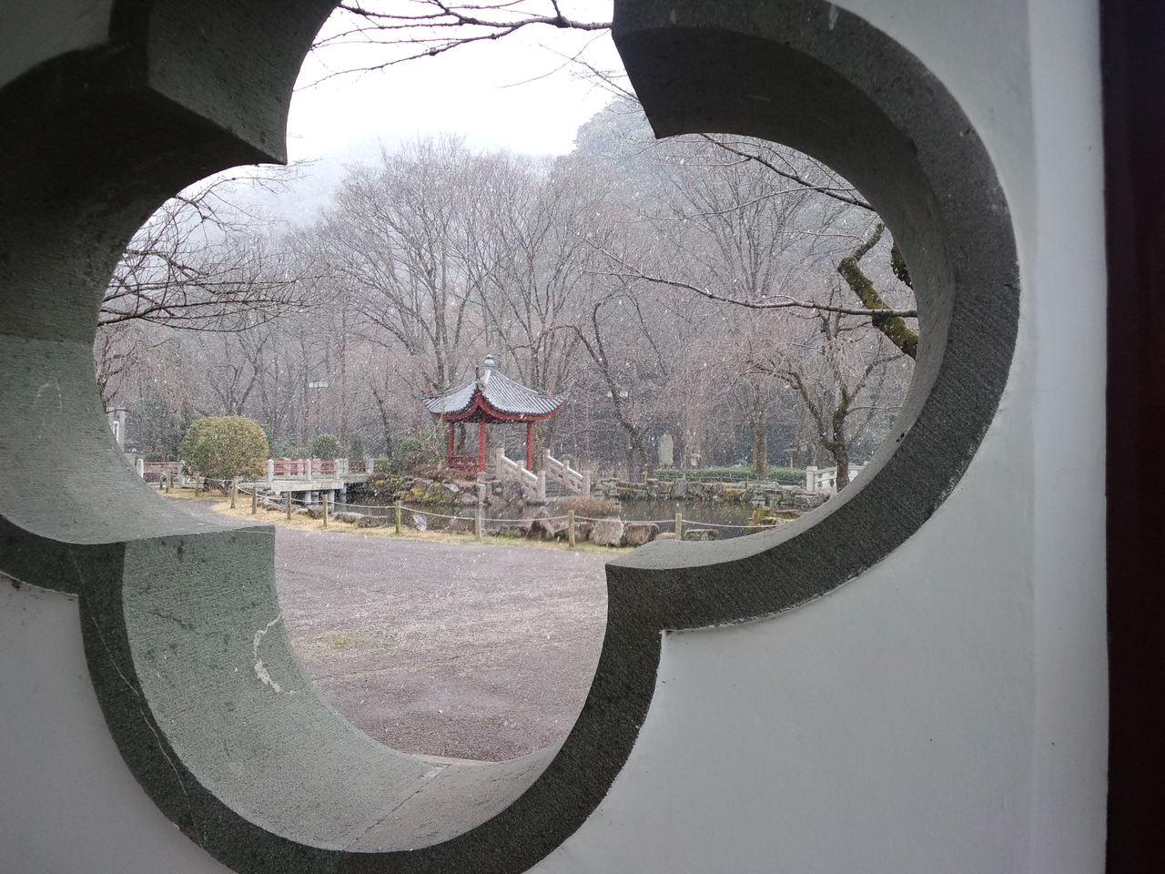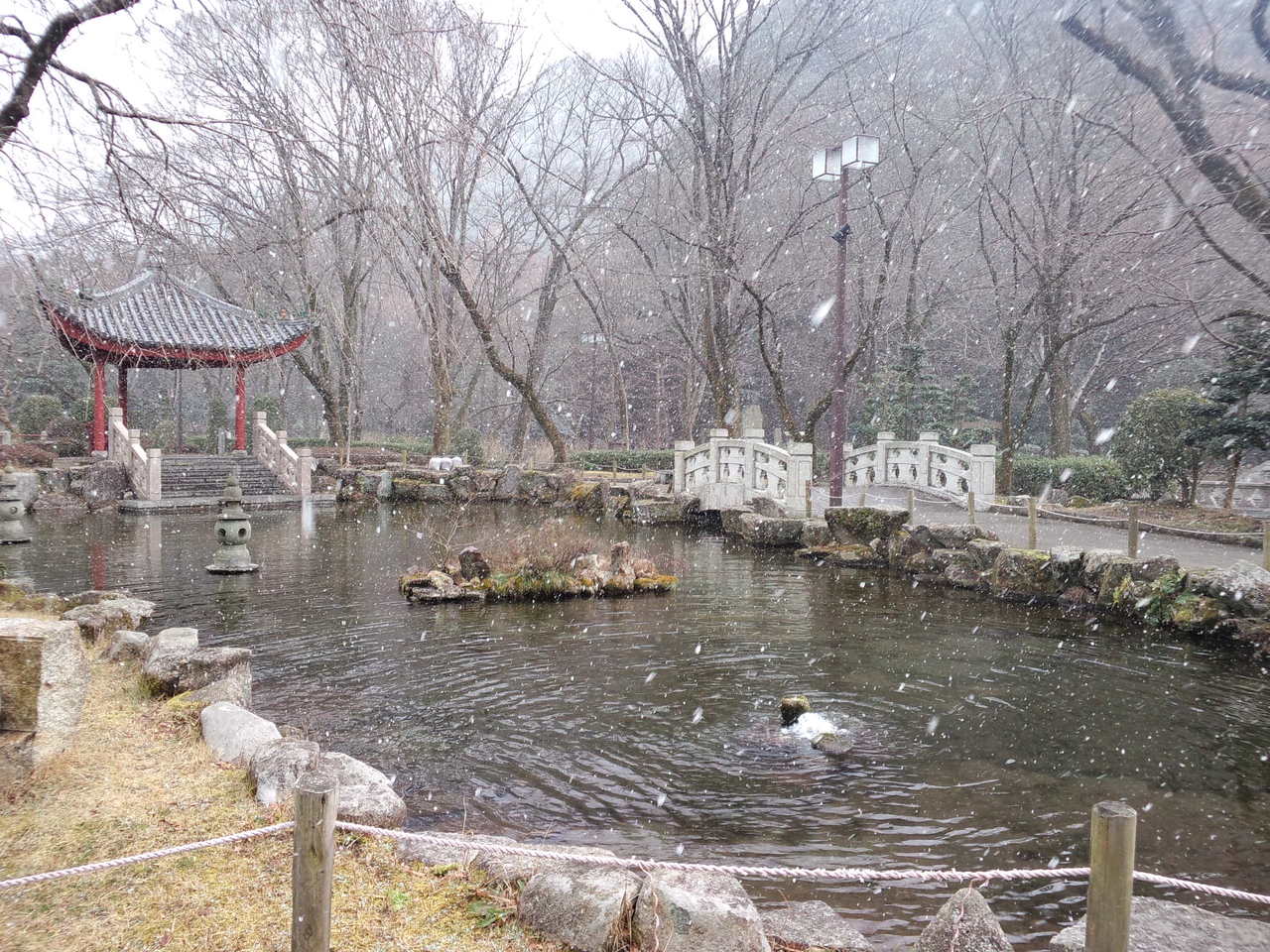 端のほうに中国風の庭園があるのですが、道路を一本はさんでいるせいもあるのか、ここまで来る人は少ないようで静かな場所です(真冬の雪降りなので余計ですね )