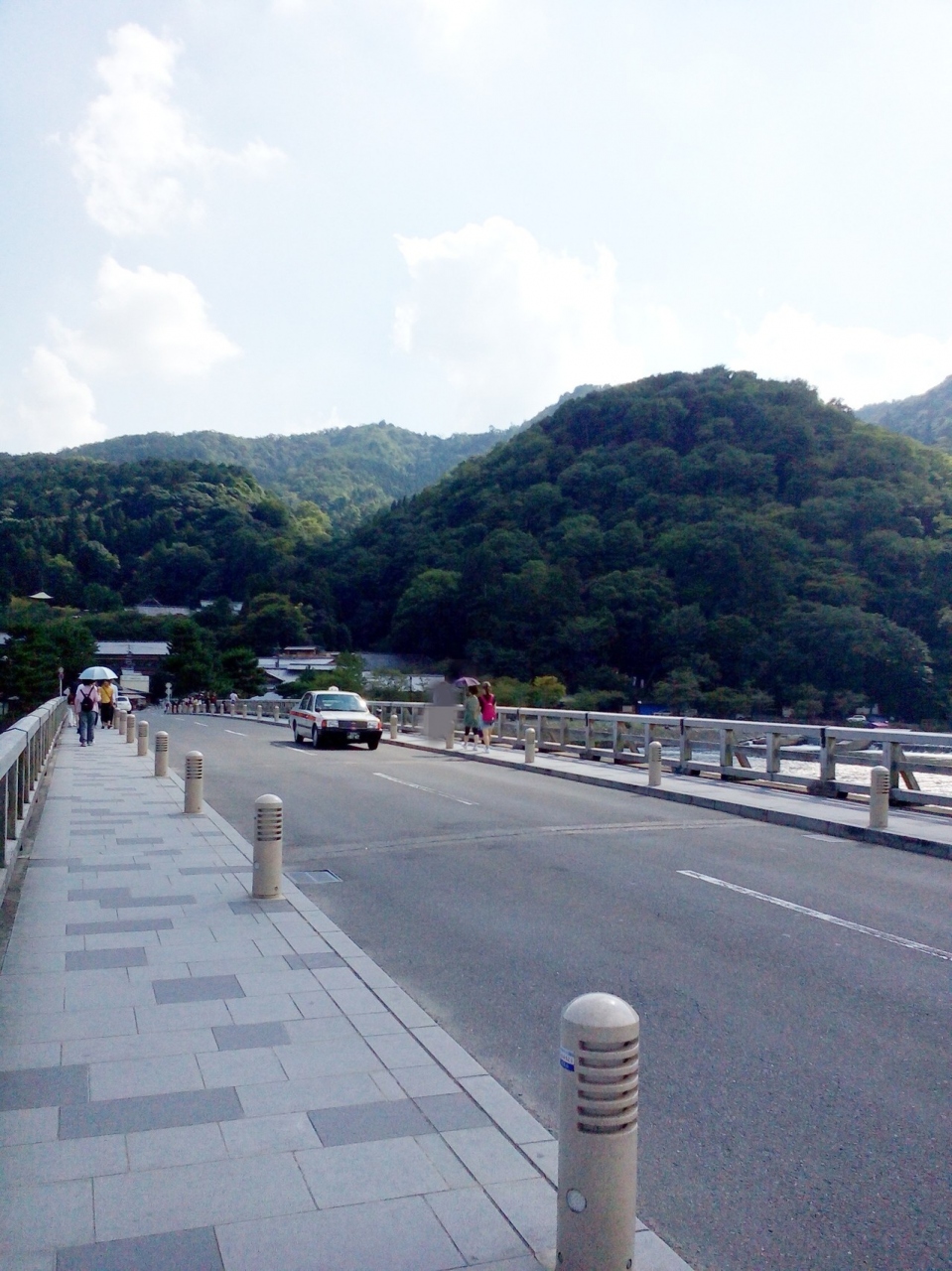 橋のたもとは嵯峨野、嵐山観光の拠点みたいな所なので、人でごった返しで、日傘をさすのもはばかられるほどでしたが、橋を渡って、川の中洲にある公園に行くと、人も少なく座る所もあったので、しばしの間、のんびりと橋のある風景を眺めていました。