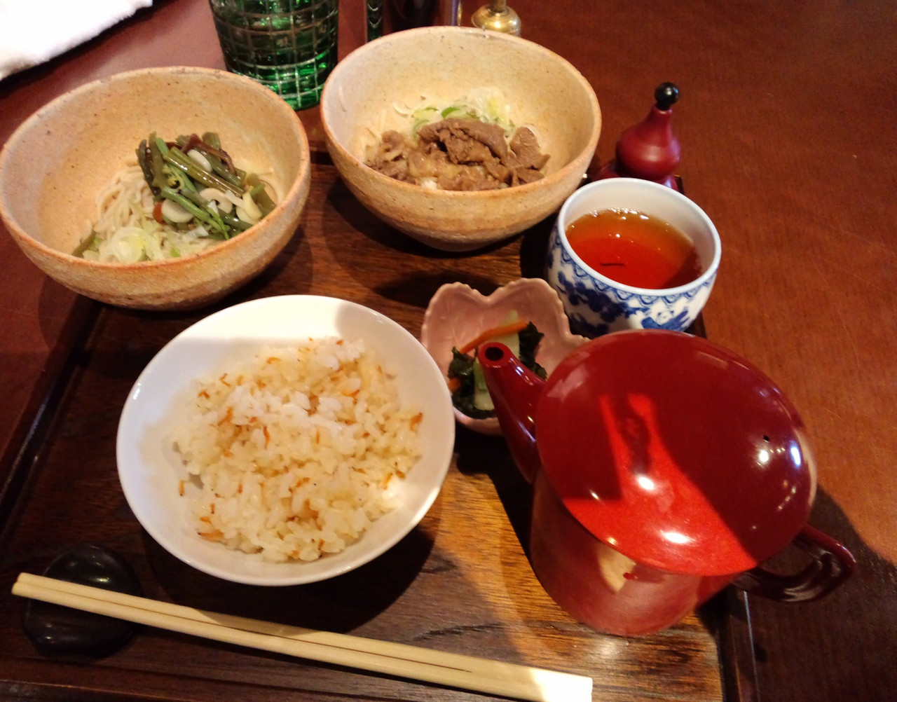 京風のおそばのセット、上品な味でとてもおいしかったですが、飲み物はついてなくて、1450円は町屋の雰囲気も込みの値段かな。