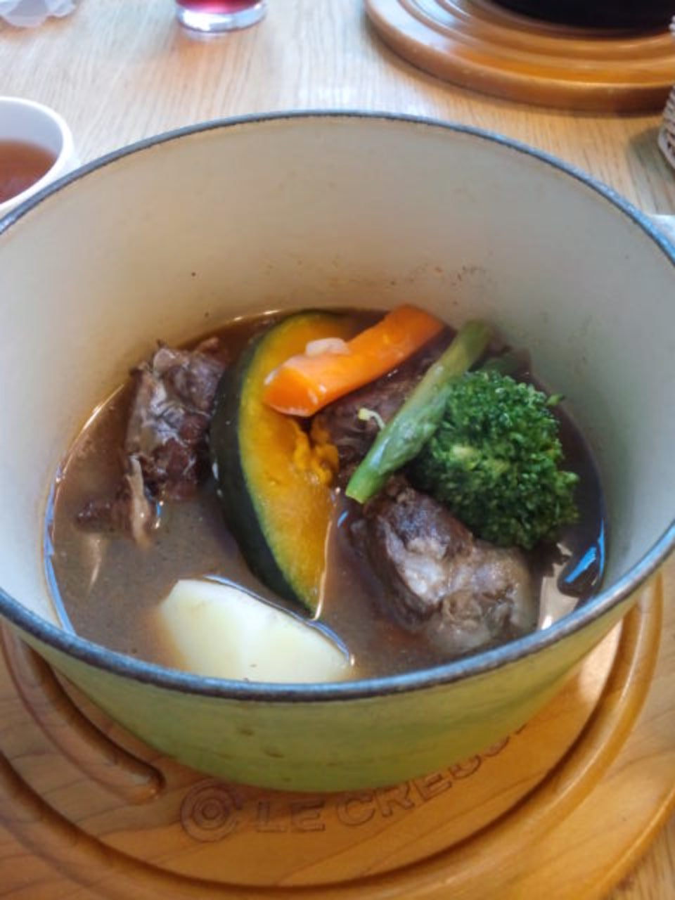 ル・クルーゼのお鍋に入った煮込み料理が一点に食べ放題のパン、ドリンクバーのセットを注文。パンはまず3個、出されるものを食べ終わってから食べ放題のパンが食べられるというようなシステム。