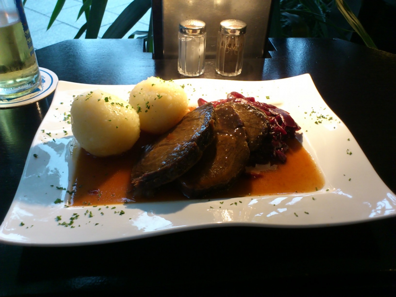 1回目はビール(EDELSTOFF 0.3l/1.9ユーロ)、ザウアーブラーテン(9.9ユーロ)、スープ(セットなのでタダだと思っていたらちゃっかり3ユーロ請求されていました。)、食後にフルーツ紅茶(1.2ユーロ)を注文し、お会計16ユーロ。