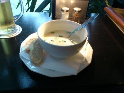 2回目はビール(EDELSTOFF 0.3l/1.9ユーロ)、カツレツとフレンチフライの付け合わせ(9.2ユーロ)、セットのスープ(ガーリックスープ/3ユーロ)を注文し、お会計14.1ユーロ。食事が終わりかけたときに中国系の団体客と欧州系の団体客が来たので退散。会計時に「胃にいいから」とソルマックの1/3程度の小瓶を頂き、その場で飲み干しました。