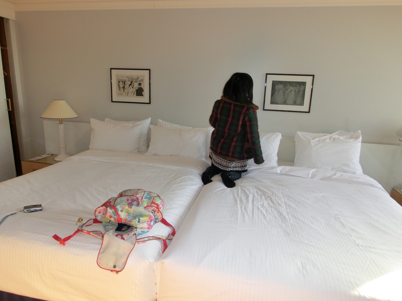 客室…室内は十分な広さで清掃も行き届いていて快適。ベッドはダブルベッド×2。ベッドを動かして2台をくっつけることができるので、子連れでも安心です。ただし、ベッドに結構高さがあるからベッドから落ちるとちょっと危ないかも。湯沸かしポットがないのもちょっと残念でした。
