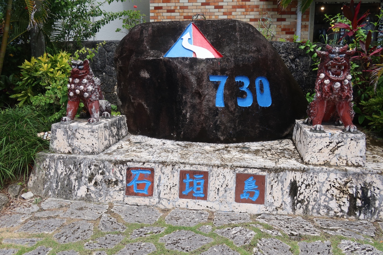 石垣島離島ターミナルを出て右手に行った所にある大きな交差点の一角に730記念碑があります。沖縄が返還され、1978年7月30日に右側通行から左側通行に変わったのを記念した碑です。しかし、なんで、この場所に記念碑が建てられたのかは分かりません。別の場所でもいいのに?