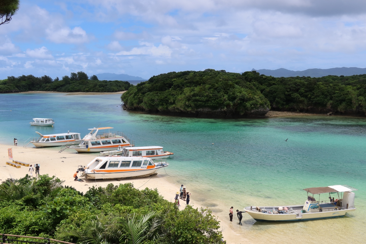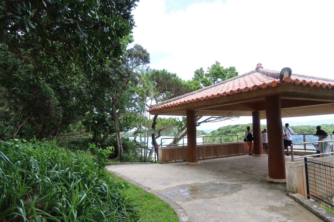 石垣島で一番人気の観光ポイントである川平湾を望む展望台が川平公園の中にあります。東屋の様になっている展望台からは雲の浮かぶ青い空の下に、グラスボートが浮かぶ川平湾の絶景を望むことができる定番の撮影スポットです。