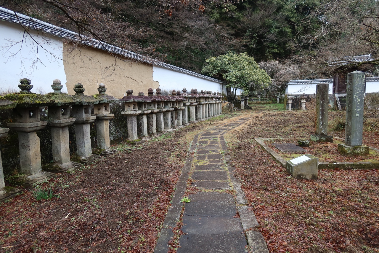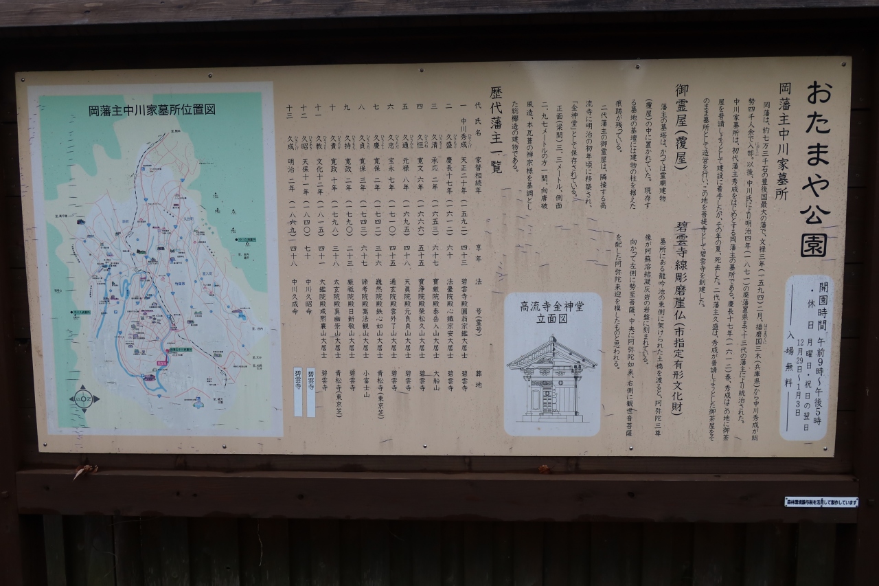 岡城址の北側を流れる稲葉川沿いにある碧雲寺の隣に岡藩主おたまや公園があります。碧雲寺は岡藩中川家の菩提寺でおたまや公園は中川家の墓所です。