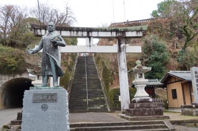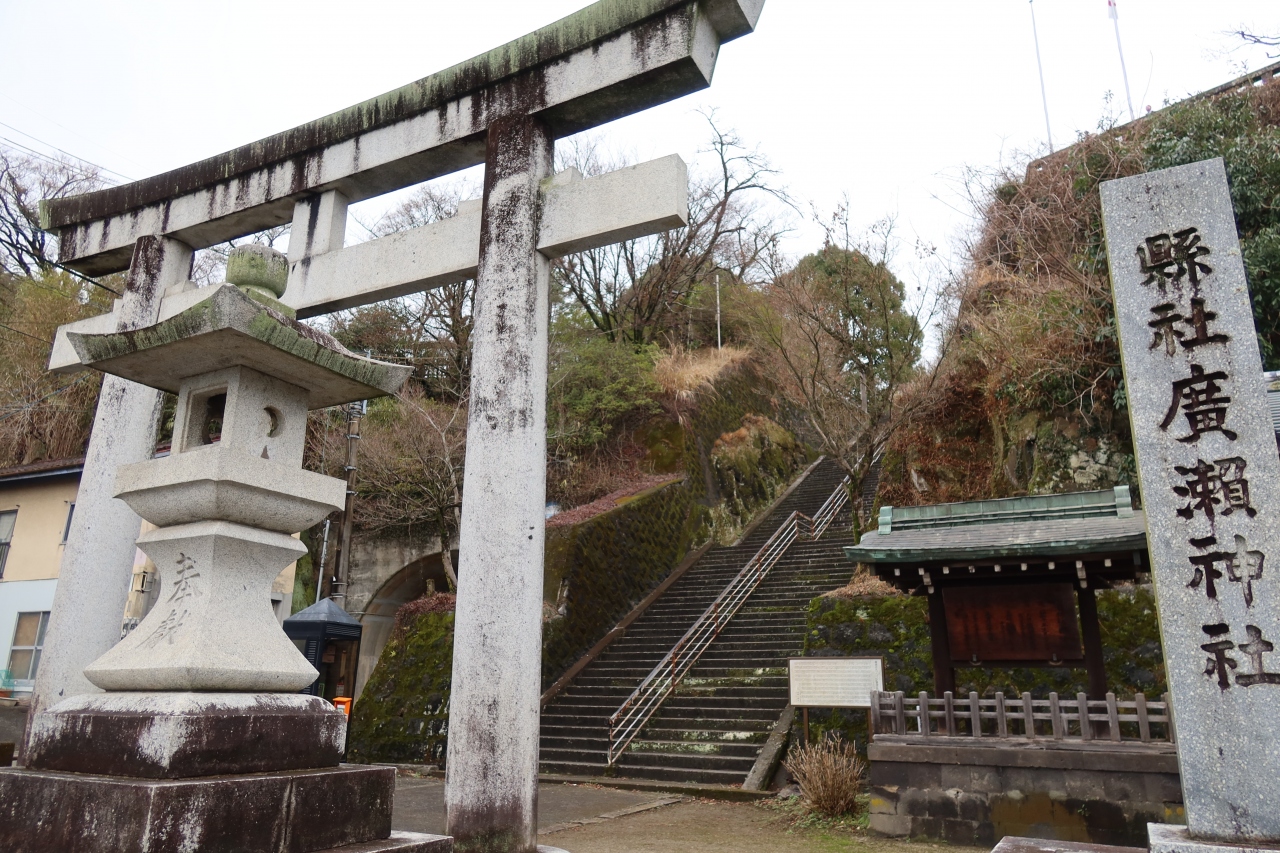 城下町交流プラザから田町通りを東に行くとトンネルがあり、その脇に銅像が立つ鳥居があります(銅像は広瀬武夫)。そこから急な石段を100段程上って右に行った所にに広瀬神社があります。