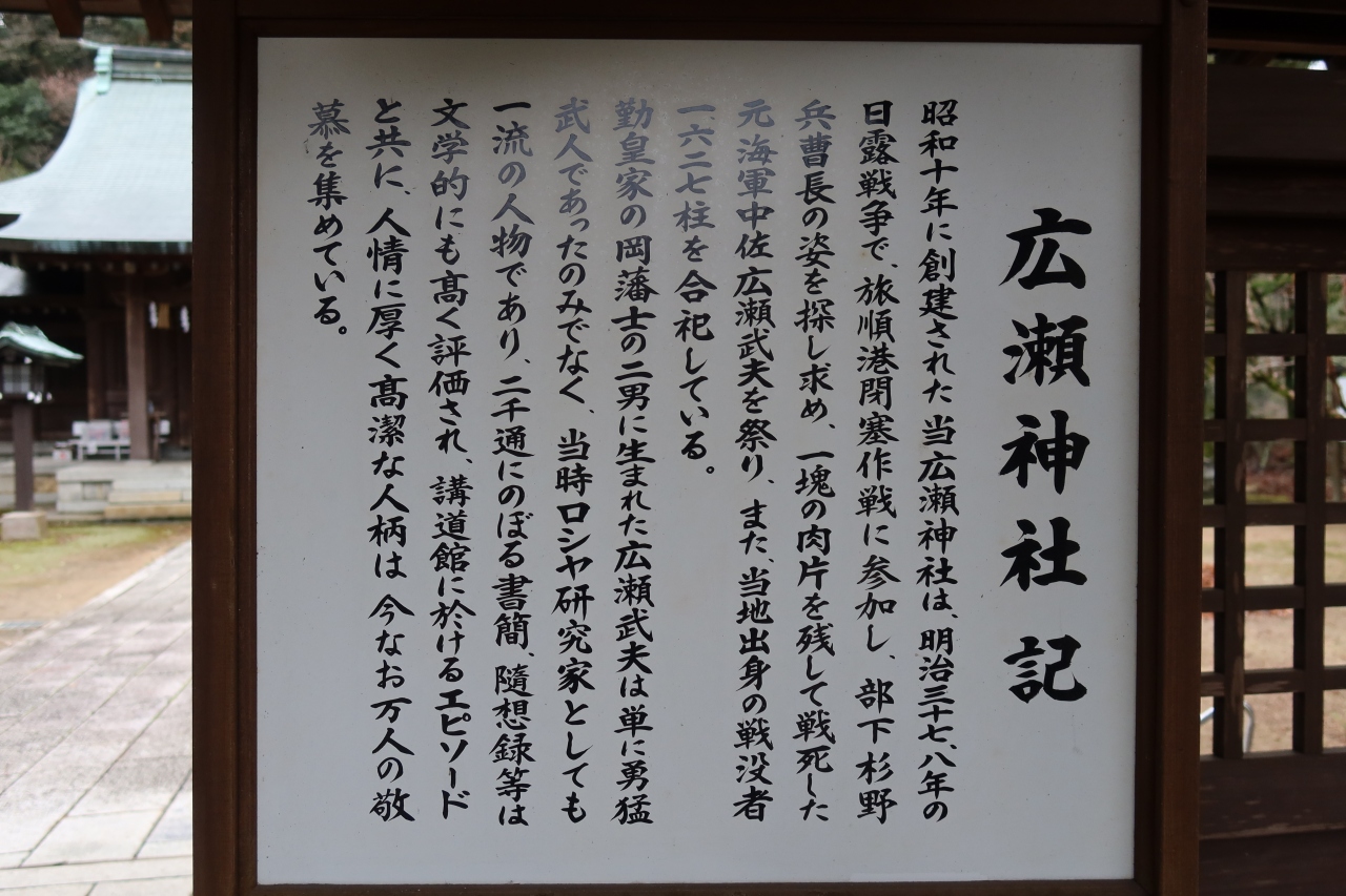 司馬遼太郎の「坂の上の雲」でも描かれた日露戦争の旅順口港閉塞作戦で戦死した英雄 広瀬武夫。その広瀬武夫を祀るのが広瀬神社。