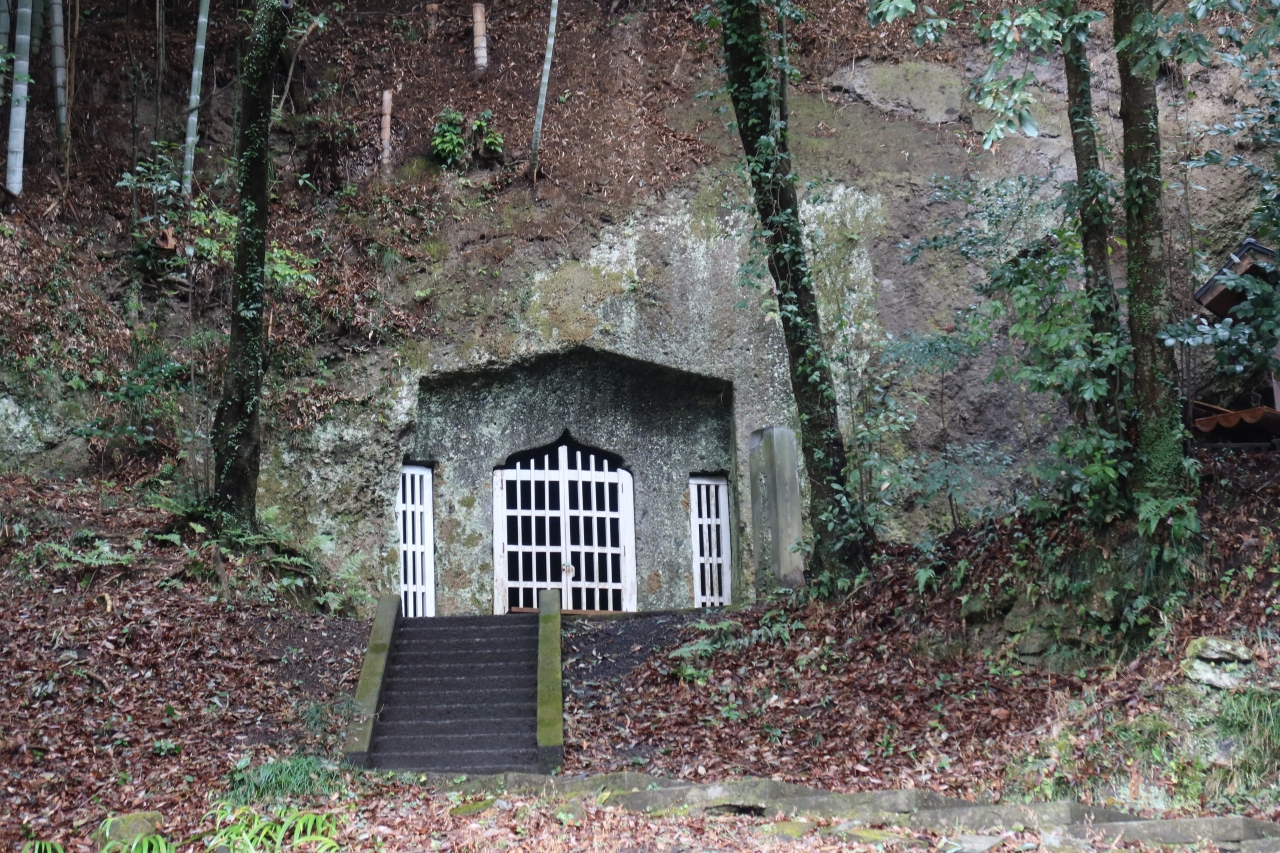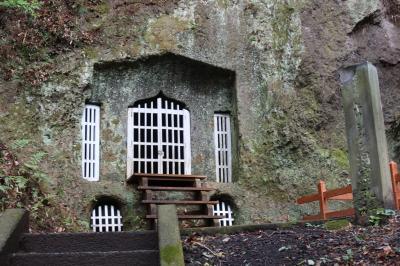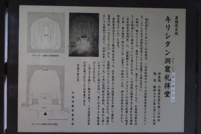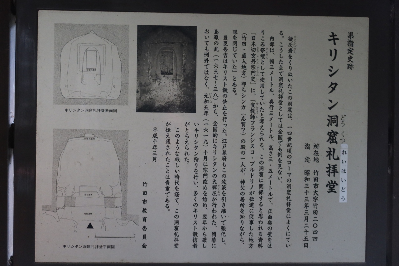 竹田の武家屋敷通りから赤松稲荷神社の方に入った坂道から左に行った先にキリシタン洞窟礼拝堂があります。岩をくり抜いた洞窟礼拝堂で格子窓から中が少し覗けます。場所的にも隠れキリシタンの礼拝堂であったことが伺える珍しい場所です。