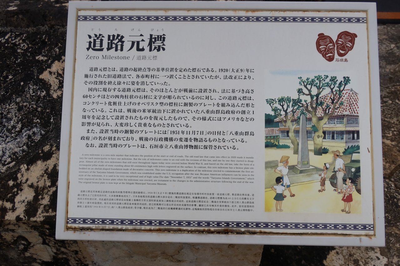 石垣島の石垣市立八重山博物館からユーグレナモールに少し行った所に石垣島の道路元標があります。道路元標は各地の道路の起点となる場所であり、この場所が石垣島の日本橋と言って良い場所です。この道路元標は戦後アメリカ軍が1951年に設置した物を復元したものだそうです。石垣島のすべての道はここから始まります。