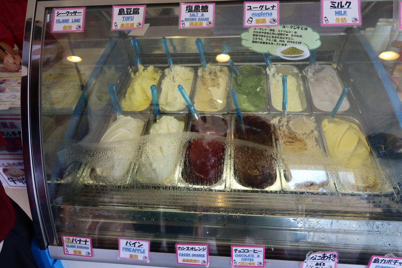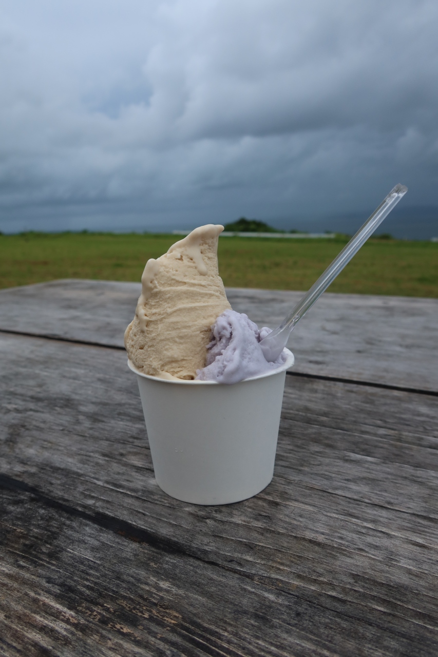 石垣島港から車で15分程、フサギビーチを見下ろす丘の上にミルミル本舗 本店があります。このお店は伊盛牧場直営のジェラート店で敷地内には土産物店も併設されています。この店では食事を採ることもできますが、何を言ってもやっぱりジェラートです。紅芋、シークワーサー、グアバ、パイン、マンゴー等、南国らしいジェラートが沢山。そして、店前の丘に設置されたベンチに座って海を望みながら食べるジェラートが美味しいです。