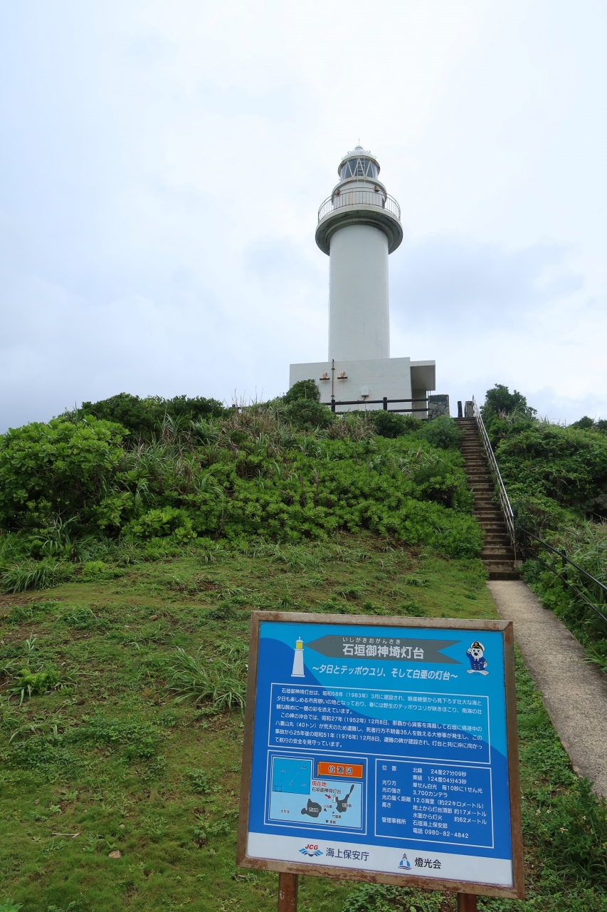 石垣島の北西部、川平湾から西に6km程にある岬が御神崎です。青い海に断崖が突き出た御神崎には白亜の灯台が建てられています。訪れた時は曇り空で海はあまり青く見えなかったのですが、透き通った海が見られ、とても綺麗でした。岬の先にある岩が茅ヶ崎の烏帽子岩似てました。