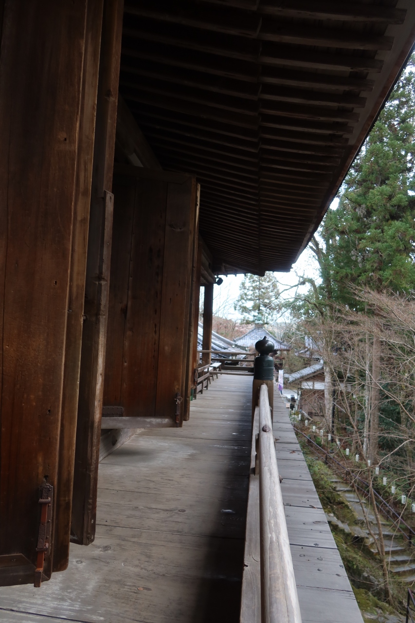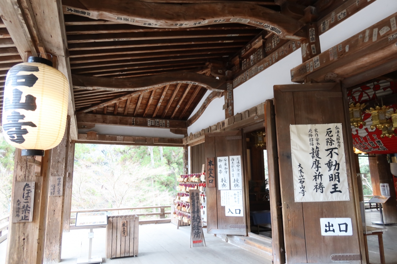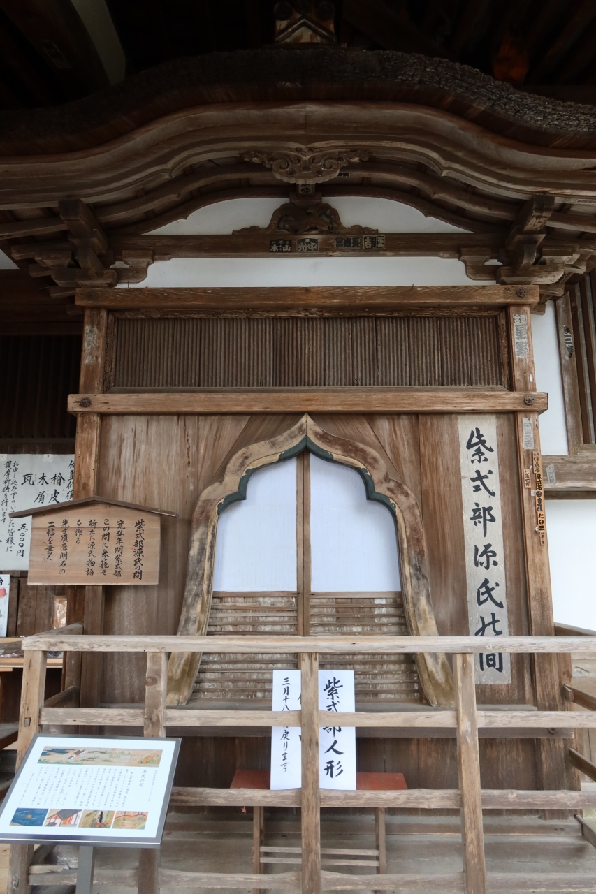 石山寺の境内の中心にある天然記念物の硅灰石の左手に行った所に本堂があります。本堂は正堂(内陣)と礼堂(外陣)が繋がった建物で、本堂の外側は清水寺の様な舞台のようになっています。入口の所にある紫式部源氏の間には紫式部像が安置されているのですが、生憎の出張?中で公開されていませんでした。