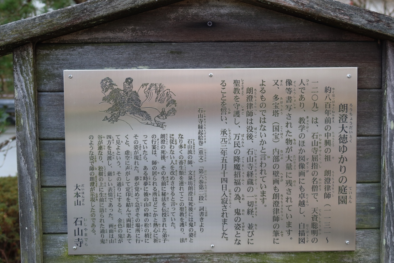 石山寺の山門の右手並びに朗澄大徳ゆかりの庭園があります。石山寺中興の祖といわれる名僧 朗澄大徳。石山寺の多宝塔の内部に描かれた壁画を描いたのがその朗澄大徳と言われています。